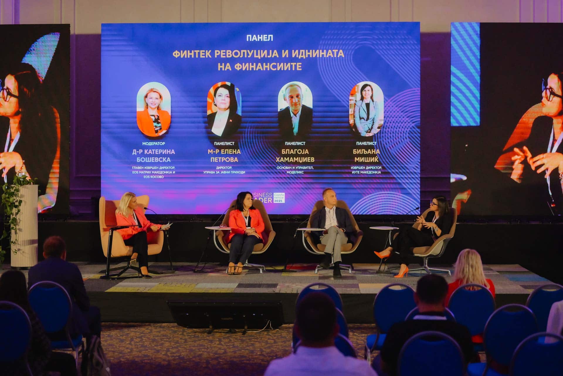 На третата панел-дискусија за „Финтек револуција и иднината на финансиите“, модерирана од генералната директорка на ЕОС Матрикс, Катерина Бошевска, беа истакнати клучните аспекти на дигиталната трансформација во финансискиот сектор. Директорката на Управата за јавни приходи, Елена Петрова, нагласи дека интеграцијата на дигиталните пари, е-фактурата и податоците во реално време во даночните процеси придонесува за поедноставна, поточна и поефикасна наплата. Таа додаде дека финтек алатките не само што ја подобруваат ефикасноста, туку градат доверба и отвораат простор за иновации и раст. Благоја Хамамџиев, основач и управител на Моделикс, посочи дека финтек индустријата го решава проблемот на крајниот корисник преку брзи, евтини и квалитетни услуги. Тој ја истакна можноста за реплицирање на успешни приказни како онлајн бакната Револут од Литванија доколку се олабави законската регулатива. Главната извршна директорка на Иуте Македонија, Биљана Мишиќ, нагласи дека во дигиталната ера, човечкиот фактор останува клучен. Според неа, иднината е во „phygital“ моделот, кој комбинира автоматизација со човечка поддршка, со цел да се изгради долгорочен однос со клиентите заснован на транспарентност и доверба.