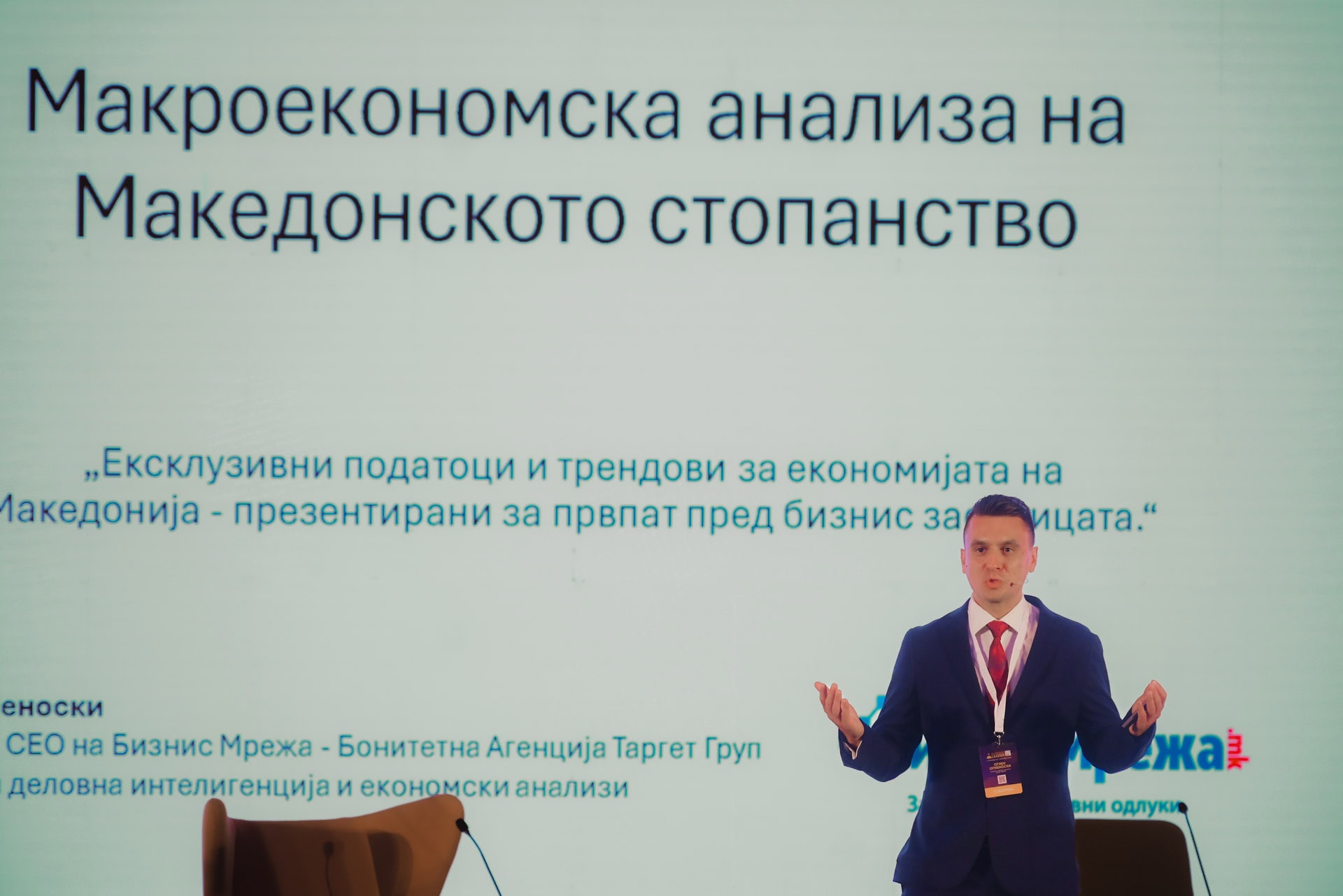 Потоа, Огнен Огненоски, основач и извршен директор на Бизнис Мрежа, ја презентираше „Макроекономската анализа на македонското стопанство за 2024 година“. Анализата откри ексклузивни податоци и трендови за економијата на Македонија. Според неа, вкупниот број на трговски друштва изнесува 73.384. Најголем број компании има во секторите: трговија на мало (19.1%), трговија на големо (9.1%), и товарен патен транспорт (4.3%). Највисоки профитни маржи остваруваат индустриите поврзани со недвижен имот (26.9%), компјутерска инфраструктура (26.7%) и друго рударство (25.5%). Најголем раст на приходите во периодот 2022-2024 е забележан во јавната управа (214%) и вадењето на сурова нафта и природен гас (72%). Во однос на странските инвестиции, компаниите со странски сопственици во 2024 година оствариле приходи од 8.8 милијарди евра и добивка од 0.5 милијарди евра. Во Македонија се регистрирани 3.522 компании со странски сопственици од вкупно 81 земја. Најмногу од овие компании се од Турција (25.1%), Србија (10.0%) и Бугарија (8.4%).