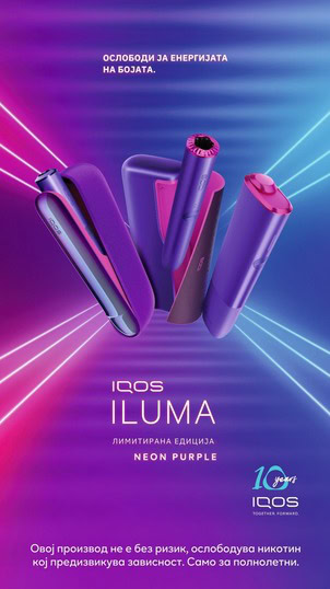 IQOS ILUMA лимитирана едиција Neon Purple веќе е достапна на сите редовни IQOS продажни места низ земјата. Овој иновативен уред освен што користи SMARTCORE INDUCTION SYSTEM технологија, која претставува најнапредната технологија за загревање на тутун до сега, се одликува и со впечатливи неонски бои и дизајн. Надворешноста на уредот е во елегантна виолетова боја, додека внатрешноста е обоена со силна магента нијанса. Како и кај претходните верзии на ILUMA уреди, нема остатоци од тутун, нема потреба од чистење, што овозможува севкупно подобро и почисто корисничко искуство.