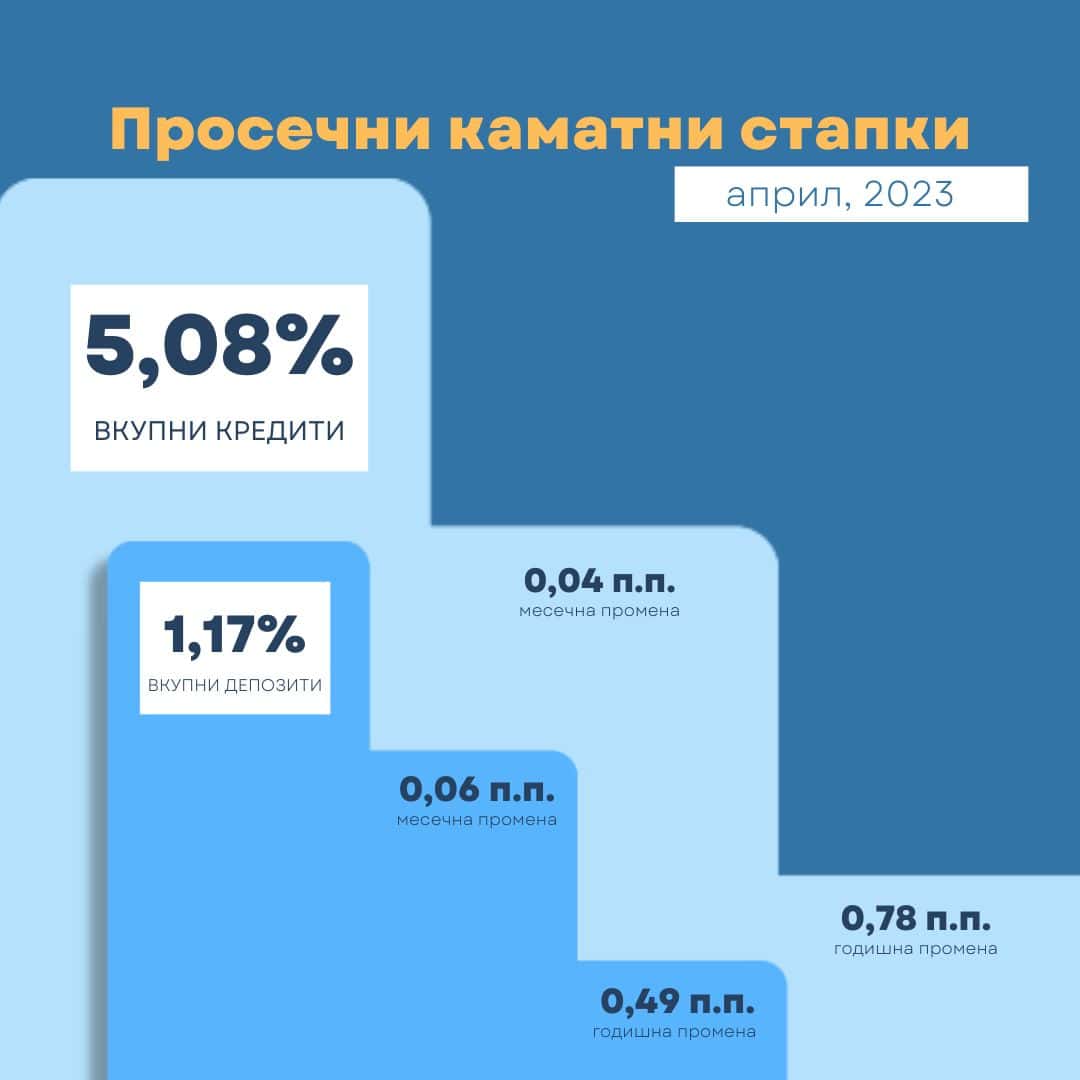 Просечната каматна стапка на вкупните кредити и на вкупните депозити во април бележи раст, покажуваат последните податоци на Народната банка. Просечната стапка на кредити е 5,08, а на депозитите 1,17 проценти.