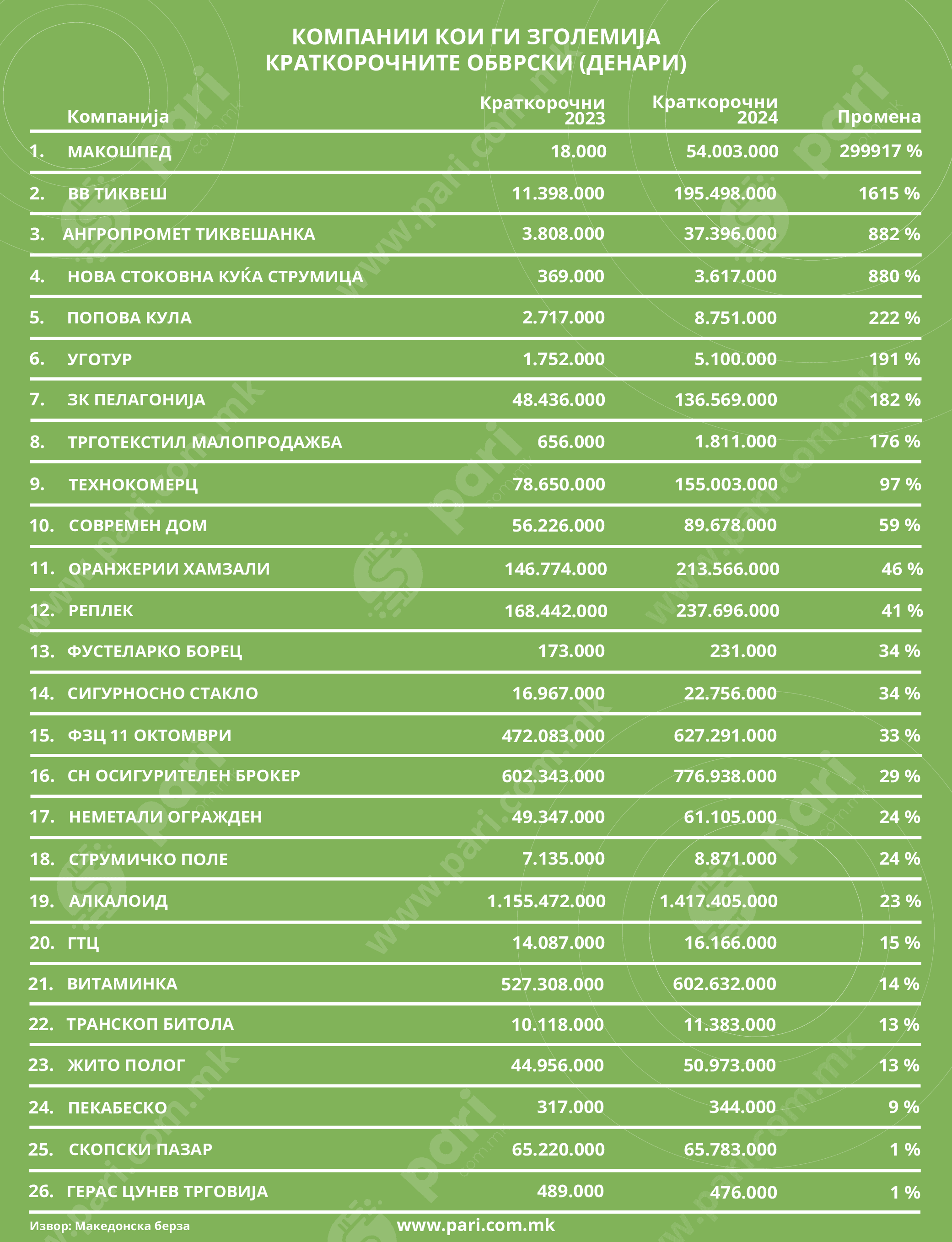 Најголем раст на задолженоста на краток рок има кај Макошпед, од дури 299.917 насто, односно обврските на компанијата се зголемени од 18.000 денари на 54 милиони денари.