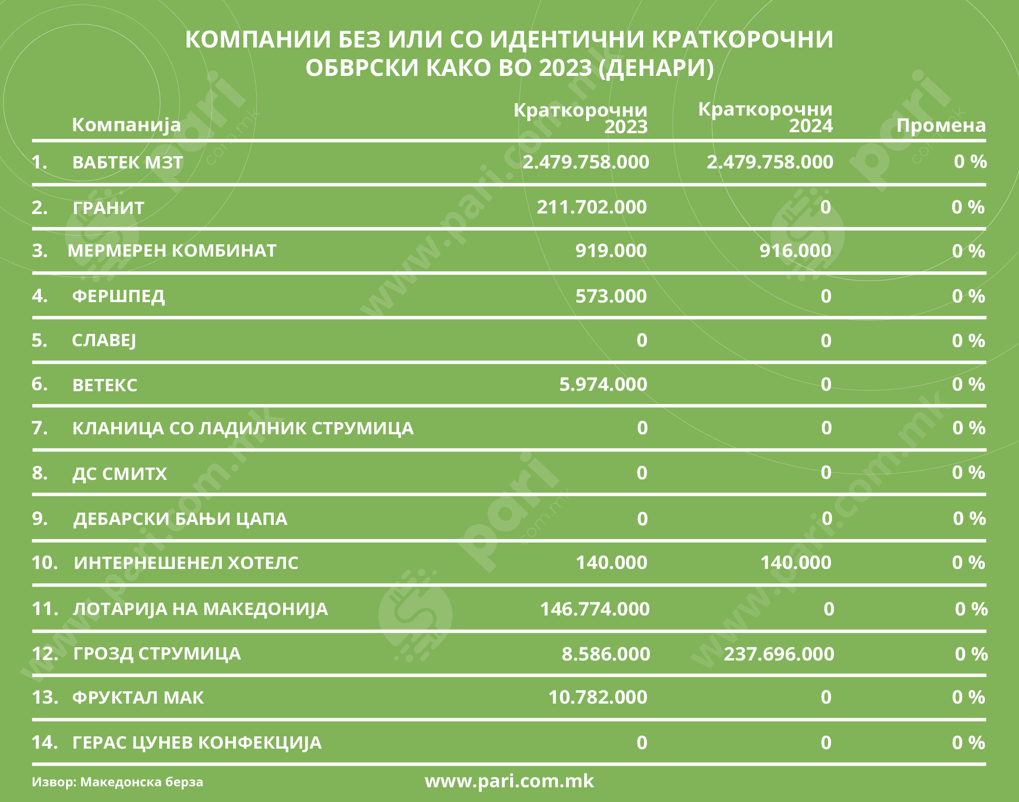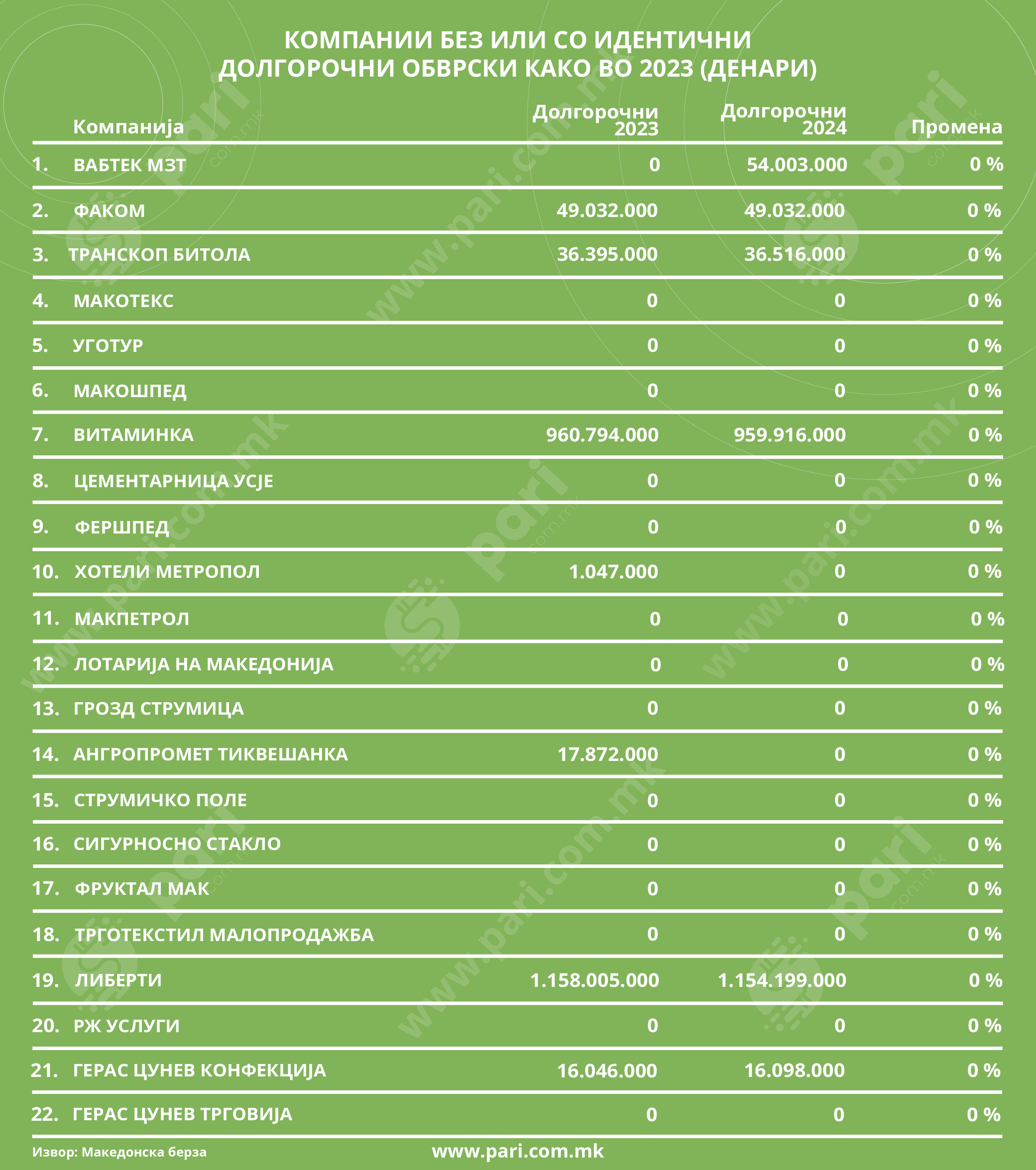 Интересно е дека од котираните компании на Македонската берза има и такви коишто немаат никаква задолженост по основ на кредити, позајмици и хартии од вредност. Дури 18 компании немале краткорочни и долгорочни обврски за кредити и позајмици ниту во 2023 ниту во 2024 година. Тие се: Окта, Македонија турист, БИМ Свети Николе, Прилепска пиварница, Европа, ТЕАЛ Тетово, Силекс Кратово, Раде Кончар Апаратна техника, Оилко КДА, ЖАС Скопје, Стокопромет, Рудници Бањани, Тетекс, РЖ Економика, Македонски телеком, РЖ Техничка контрола, Мода Свети Николе и Интерпромет.