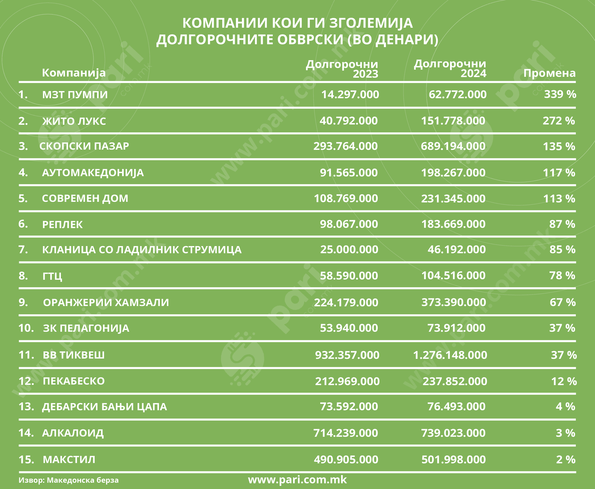 Кога станува збор за долгорочните обврски на котираните компании по основ на кредити, позајмици и хартии од вредност, само 15 компании во минатата година решиле да го зголемат своето задолжување со цел финансиски да го поддржат своето работење. Меѓу овие компании, најголем раст на долгорочните обврски, од 339 насто, има МЗТ Пумпи, со што нејзините обврски пораснале од 14,3 милиони денари на 62,8 милиони денари.