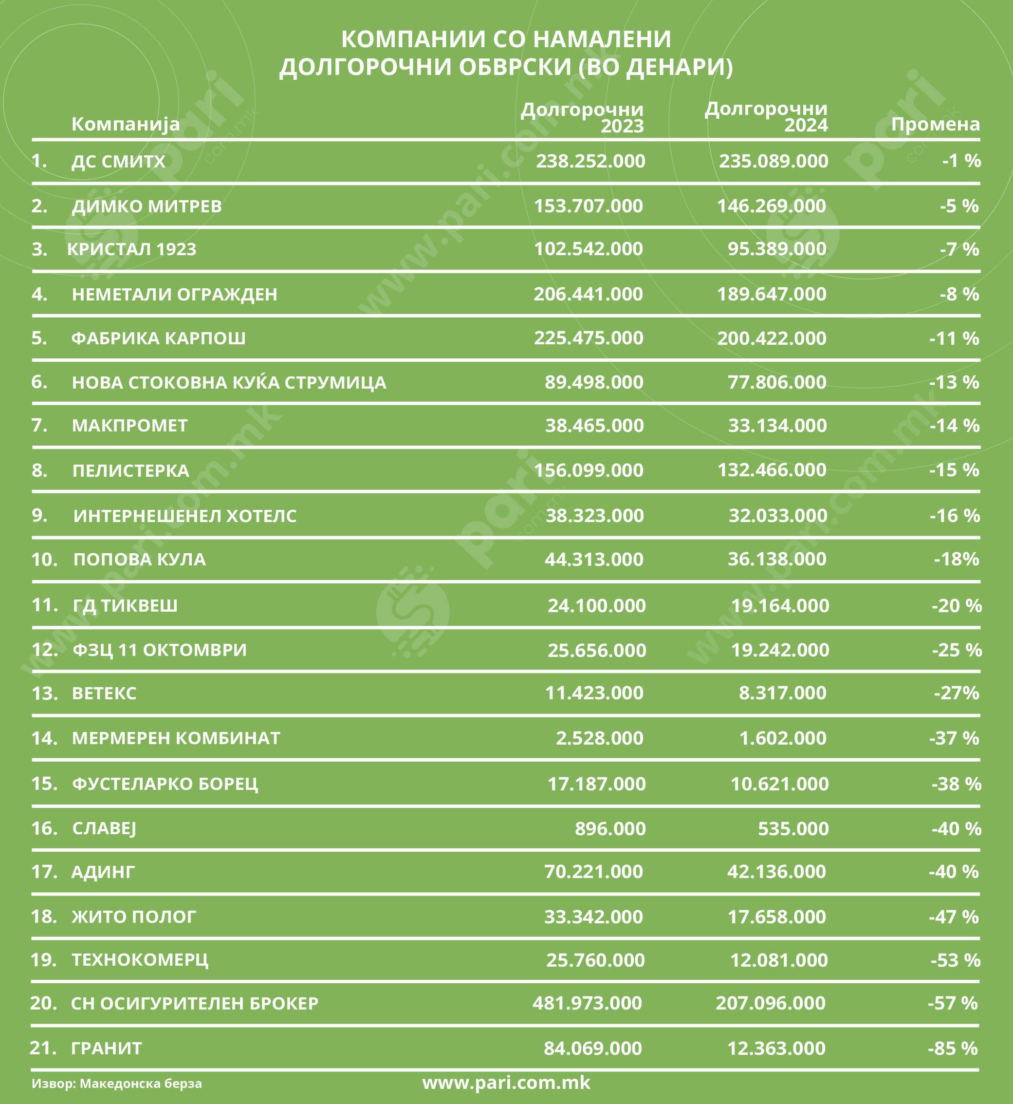 Во следната група се 21 компанија коишто во минатата година ги намалиле своите долгорочни финансиски обврски кај кредиторите, што од една страна може да се толкува како растоварување на нивните финансии, а од друга страна веројатно и како сигнал дека немаат потреба од надворешна финансиска инјекција. Останува да видиме како ќе влијае тоа врз нивното работење во 2025 година. Убедливо најголем пад на долгорочните финансиски обврски, од дури 85 насто, има кај градежната компанија Гранит.