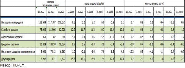 Месечен и годишен пад е регистриран кај задолжувањето преку кредитни картички – за 0,3 на месечно и за 3,8 отсто на годишно ниво. Негативните салда на тековните сметки во ноември се пониски за 0,7 проценти на месечна основа, додека на годишна основа се со од 4,8 насто.