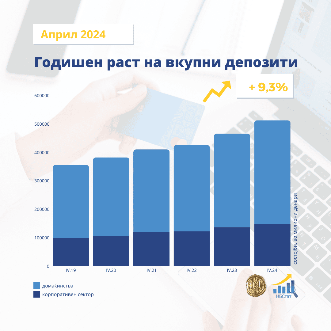 Официјалните бројки велат дека во четвртиот месец од годинава депозитите бележат раст од 1,3 процени, кој произлегува исклучиво од домаќинствата, затоа што кај корпоративниот сектор има намалување. Или, вкупните депозити изнесуваат 538,272 милиони денари, односно 8,74 милијарди евра, од кои од граѓаните се доверени 364,385 милиони денари (5,91 милијарда евра), а од компаниите 148,738 милиони денари (2,41 милијарда евра).