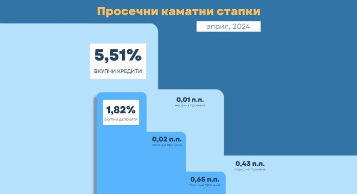 Просечната каматна стапка на вкупните кредити во април изнесува 5,51, а на депозитите – 1,82 проценти. Кај првата е забележан годишен раст од 0,43, а кај втората за 0,65 процентни поени.