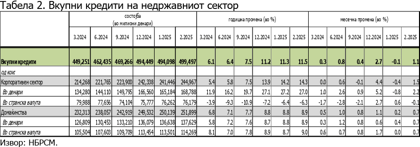 Корпоративен сектор – Депозитите на компаниите изнесуваат 165.805 милиони денари (2,69 милијарди евра). Во текот на февруари се намалиле за еден процент, „како резултат на падот на краткорочните депозити во странска валута“. Наспроти тоа, имаат годишен раст од 7,4%.