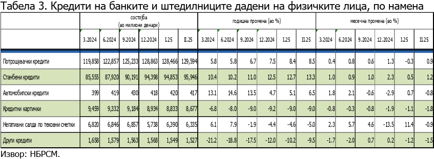 Потрошувачките кредити, кои се убедливо најбарани и најкористени, од јануари до февруари се зголемиле за 17,85 милиони евра, или за 0,9 проценти. Се работи за сума од 129.594 милиони денари/2,1 милион евра. Растот на годишна основа е за 8,5 проценти.