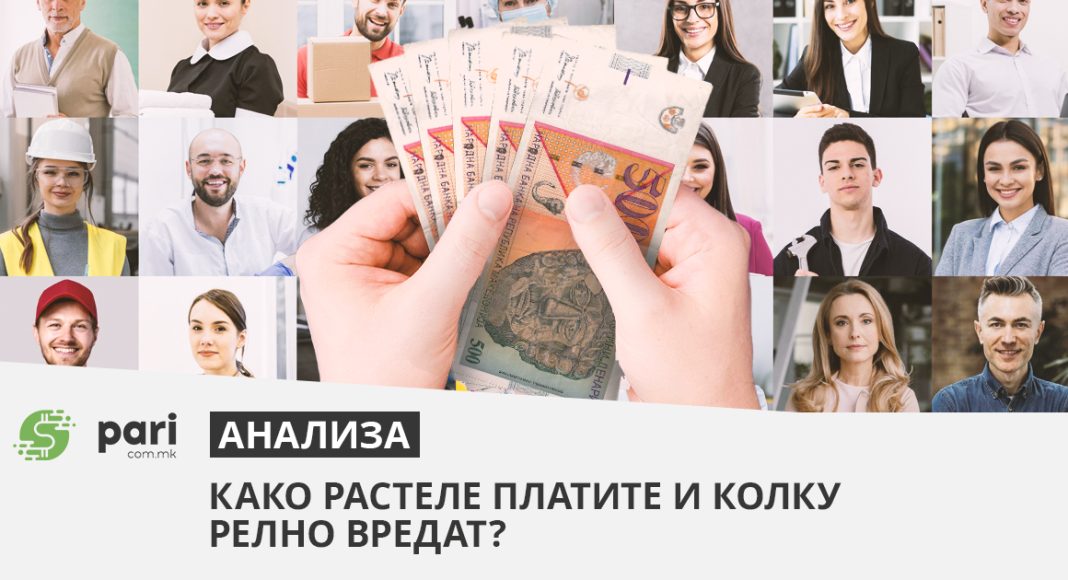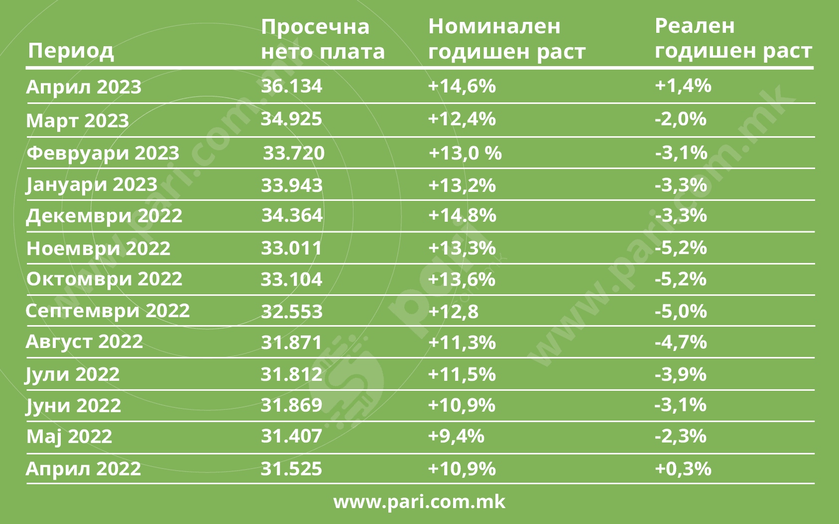 За првпат, по точно една година, Државниот завод за статистика објави дека има реален раст на платите, што значи дека не само што се зголемиле номинално, туку се зголемиле и кога ќе се пресмета инфлацијата. Просечната месечна исплатена нето-плата по вработен во април 2023 година изнесува 36.134 денари, пресмета Државниот завод за статистика. Оттаму велат дека априлската плата номинално е поголема за 14,6 проценти во однос на лани, но и реално – со пресметаната инфлација, платата е поголема за 1,4 проценти. Ова значи дека растот на платите почнува да ја претркува инфлацијата, покажува анализата на порталот Пари.