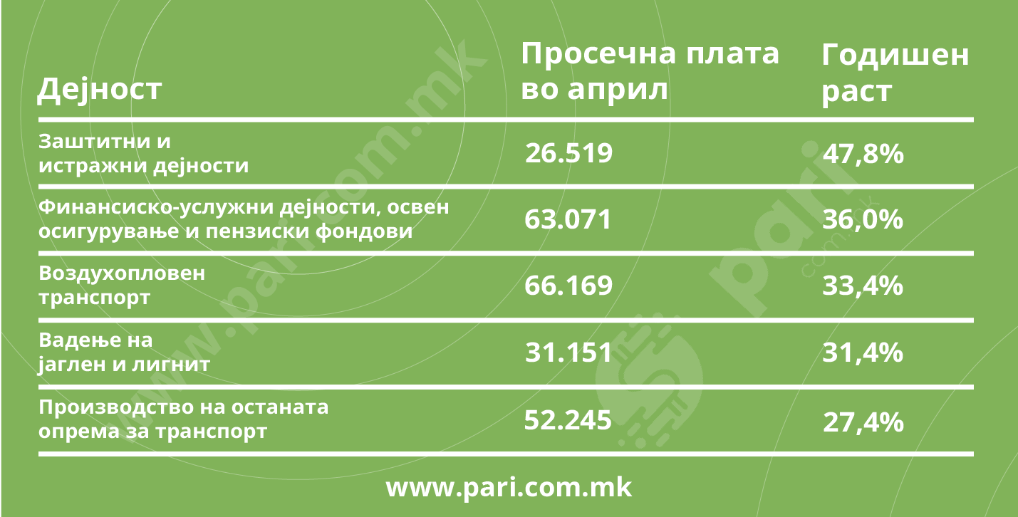 Со раст од 47,8 проценти, просечната нето-плата за една година најмногу се зголемила во секторот Заштитни и истражни дејности. Таму просечната априлска плата била 26.519 денари и сѐ уште е многу пониска од просечната плата на републичко ниво. Инаку, во оваа дејност спаѓаат агенциите за обезбедување на имот и лица, а секторот долго време го држеше последното место по висина на просечни плати.