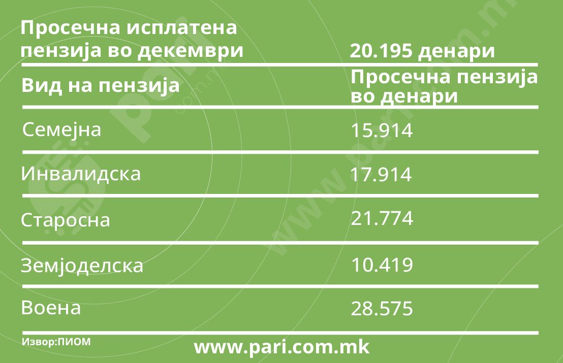 Просечната исплатена пензија во декември е 20.195 денари и е за 13 денари пониска од ноемвриската. Вообичаено, со најнизок просек се земјоделските, а со највисок воените пензии. Од март ќе бидат повисоки, бидејќи тогаш ќе има усогласување на пензиите со движењата забележани кај трошоците на живот и просечната плата.