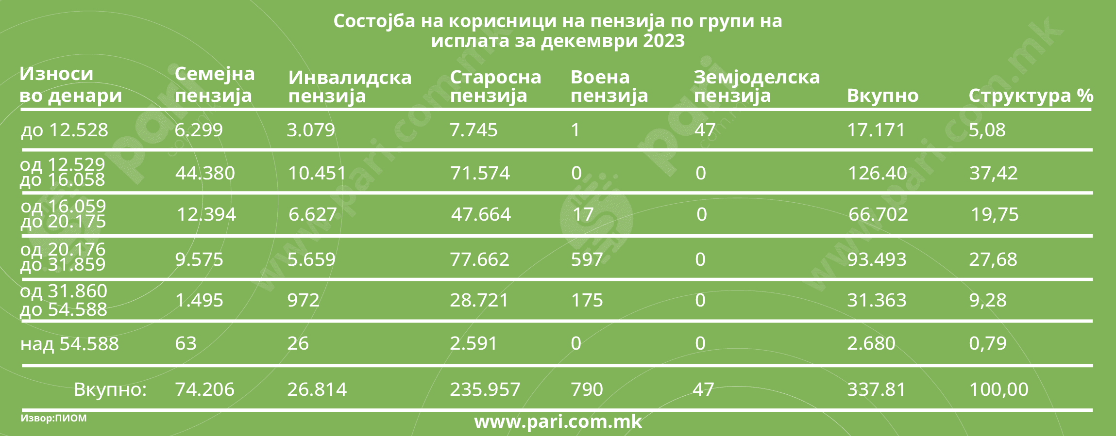 Податоците на Фондот за пензиското и инвалидско осигурување покажуваат дека за еден месец значително е намален бројот на лицата со пензии до 12.528 денари. Од 23.476 во ноември, на 17.171 во декември. Со тоа, нивното учество во корисничката структура е 5,08 отсто (7% претходно).