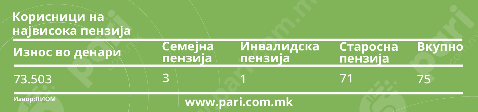 Највисоката пензија во државата е во износ од 73.503 денари. Ја примаат 75 лица (за еден повеќе во споредба со ноември). Како семејна пензија ја користат тројца пензионери, инвалидска – еден, а како старосна 71 лице.