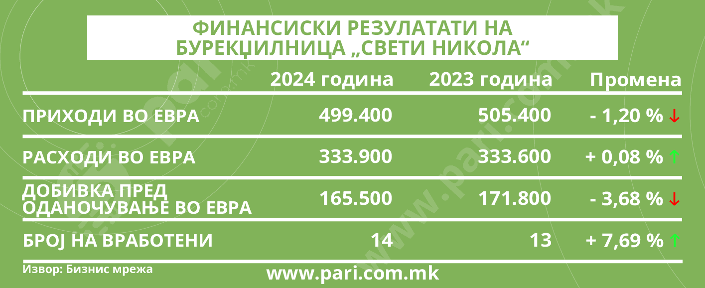 Минатата година, за купените производи во бурекџилницата граѓаните оставиле 30.713.420 денари. Или, речиси половина милион евра. Споредено со претходната 2023 година, прометот опаднал за нешто повеќе од еден отсто. Тогаш приходот изнесувал над 505 илјади евра.