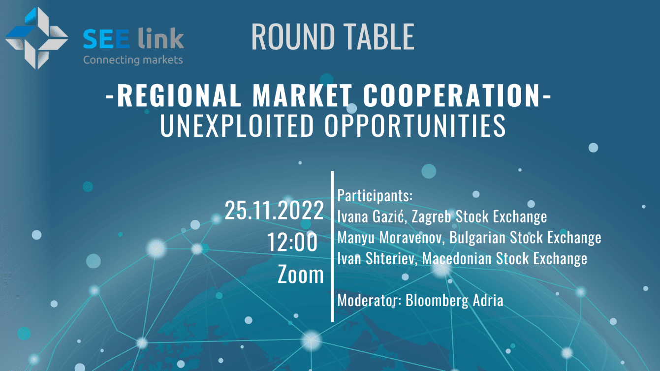 Што е направено и какви се очекувањата? Одговорот на ова прашање се очекува да го даде дискусијата на тркалезната маса “ Регионална пазарна соработка – неискористени можности” во организација на SEE Link, компанија основана од берзите од Загреб, Македонија и Бугарија. Настанот се одржува преку платфромата ZOOM на 25.11.2022 година ( петок).