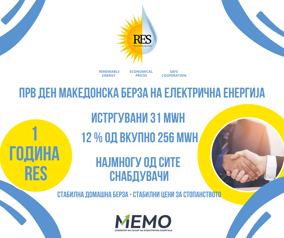 Компанијата РЕС (Renewable Energy Supply), вчера, на првиот ден од работењето на македонската берза за електрична енергија, истргува најголемо количество енергија од сите снабдувачи, односно 31 мегават часови, или 12% од вкупното количество од 256 мегават часови, истргувани од страна на 20 компании кои вчера учествуваа на берзата.