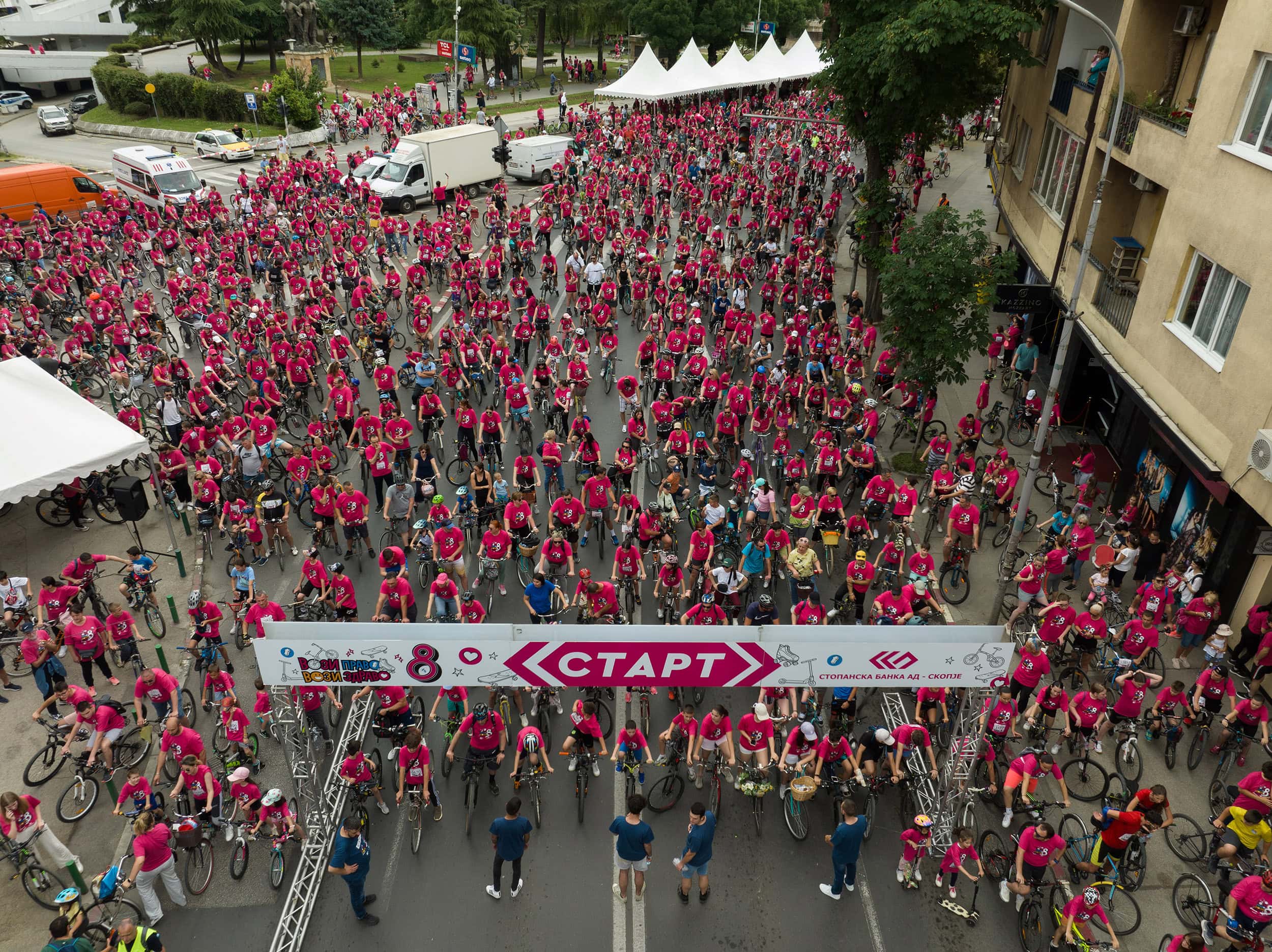 Над 8.000 луѓе од сите возрасти вчера возеа низ „ослободените“ улици од возила во центарот на Скопје и дадоа придонес во промовирањето здрави животни навики, како дел од настанот „Вози право, вози здраво“ кој Стопанска банка – АД Скопје го организира по осми пат. Во годината кога Банката прославува 80 години од постоењето, осмото издание на традиционалната ревијална трка повторно на едно место ги собра сите љубители на еколошкиот превоз на тркала, како урбана форма на транспорт која е економична, безбедна и не ја загадува животната средина.