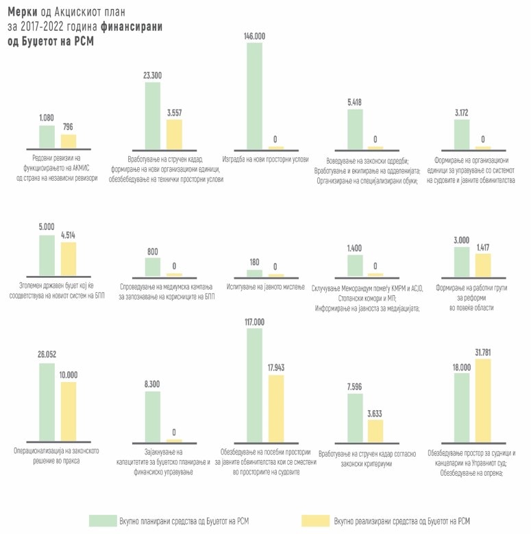 Минимални 20 проценти од планираните буџетски пари се искористени за реформи во правосудството. Конкретно, за предвидениот четиригодишен период (од 2017 до 2022), биле обезбедени 366 милиони денари или шест милиони евра за реализација на 15 мерки. Но, од тој износ се потрошиле само 74 милиони денари, односно 1,2 милиони евра, констатираа државните ревизори врз база на извршената ревизија на успешност на тема „Ефективност на спроведувањето на Стратегијата за реформи во правосудниот сектор 2017 – 2022 и спроведување на Акцискиот план на Стратегијата. Целта на извршената ревизија била да се даде одговор на прашањето: „Дали мерките и активностите дефинирани во Акцискиот план придонесуваат за остварување на целите од Стратегијата за реформи во правосудниот сектор 2017 – 2022 година?“