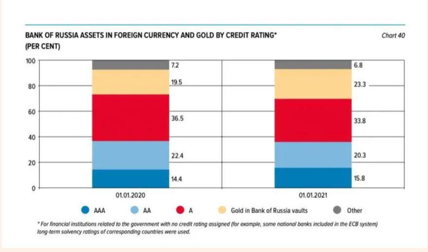 Хартиите од вредност сочинуваат малку повеќе од половина (311 милијарди американски долари) од она што руската централна банка го имаше на располагање. Според нивниот годишен извештај, овие средства главно биле високо оценети, при што само 6,8 отсто од нив имале рејтинг помалку од А.