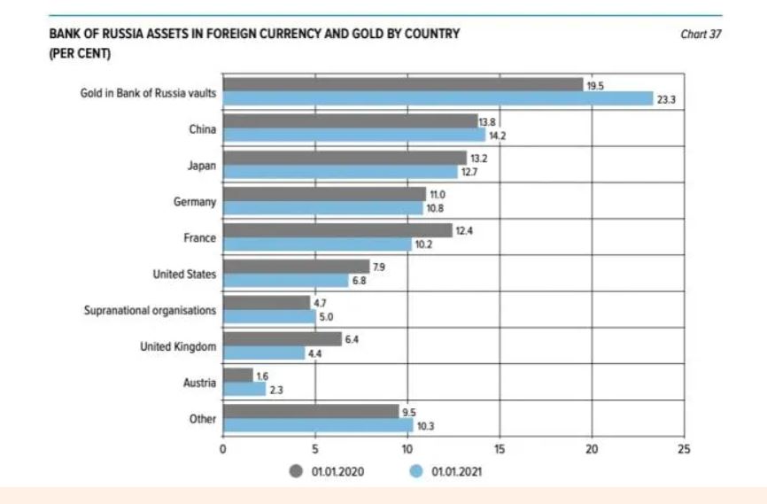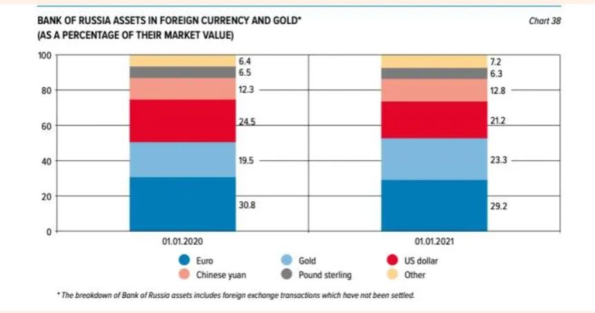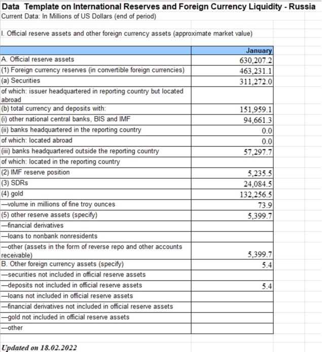 Санкциите наметнати од САД, ЕУ и Велика Британија против централната банка веројатно ќе направат многу, ако не и целосно, од овие резерви бескорисни. Фајненшл Тајмс објави листа, позната како „Шаблон за податоци за меѓународни резерви и девизна ликвидност“ за Русија, од пред почетокот на инвазијата врз Украина, преземена од профилот на Твитер на меѓународниот финансиски експерт Метју Клајн бидејќи официјалните податоци на веб-страницата на руската централна банка, повеќе не се достапни.