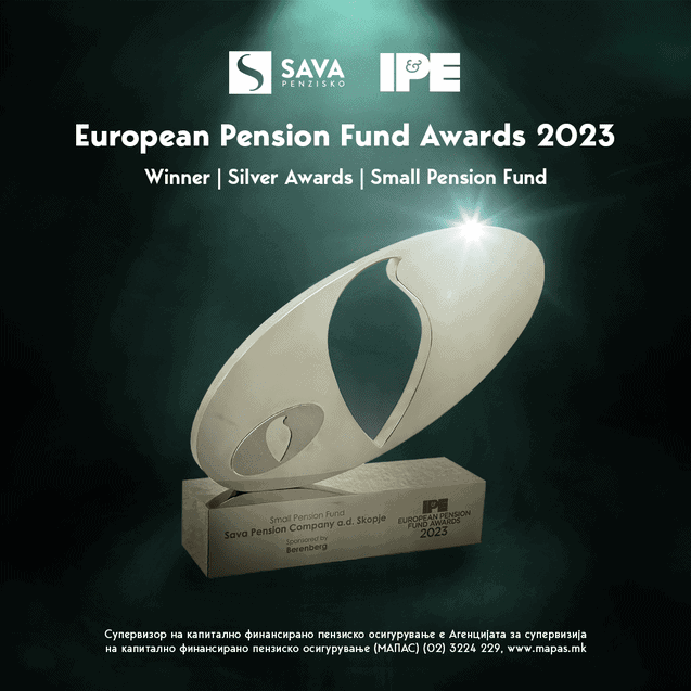 На овогодинешното доделување на престижните IPE (Investment & Pensions Europe) награди, кое се одржа во Виена, Австрија, Сава пензиско друштво е прогласено за победник во категоријата „Small pension fund“ (Мал пензиски фонд) која се однесува на управувачи со средства до 1 милијарда евра под управување.