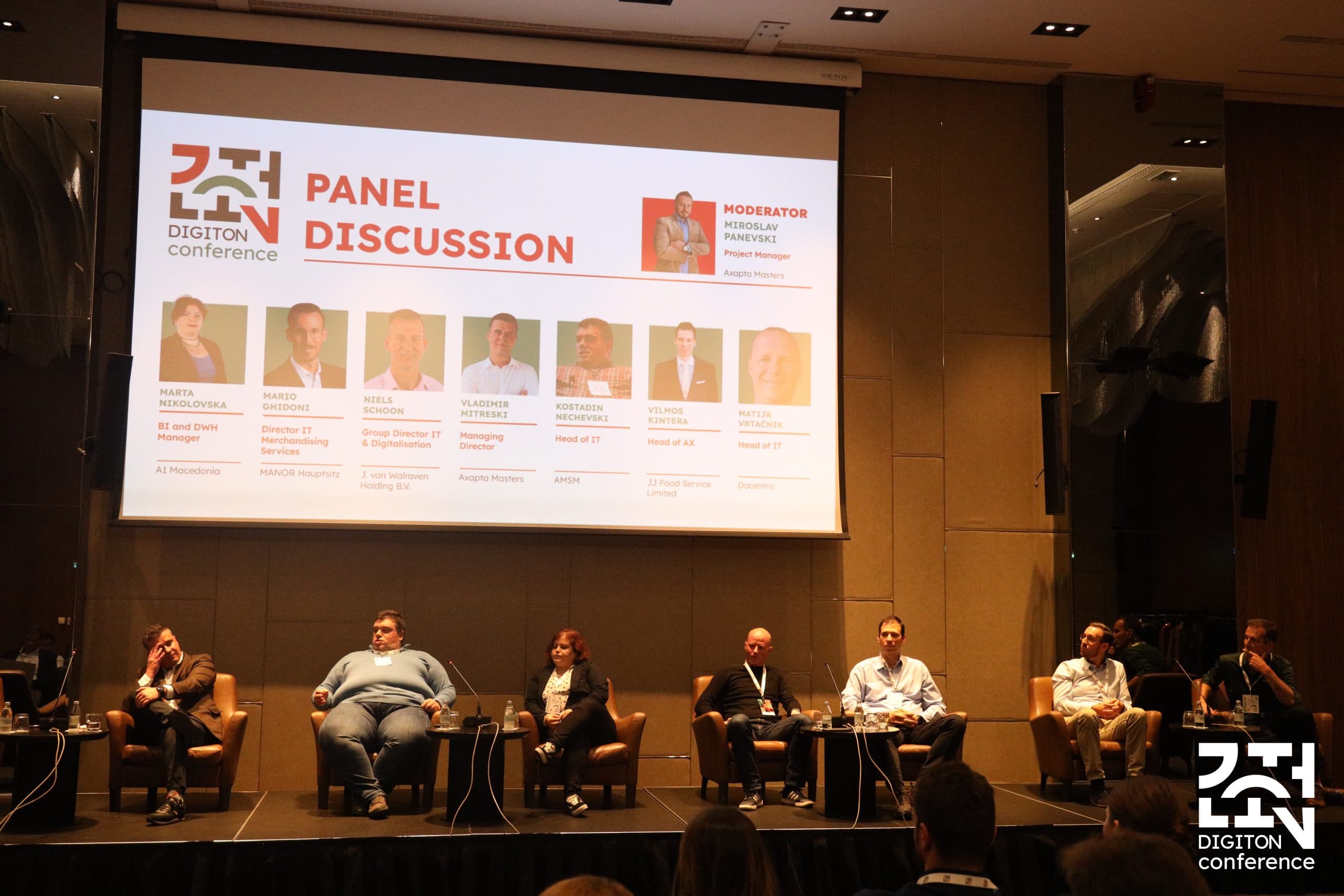 Дел од говорниците споделија искуство со дигиталната трансформација на своите компании, а големо внимание привлече и панел дискусијата на тема: Future of Business Applications, AI/Cloud/Security, од која дел беа: Владимир Митрески, еден од тројцата менаџмент партнери и сопственици на компанијата Axapta Masters, Костадин Нечевски, директорот на ИТ одделот во Авто – Мото Сојуз на Македонија, Марио Гидони, Директор IT Merchandising Services од Manor, Нилс Шун, ИТ директор и дигитализација од J. van Walraven Holding B.V., Вилмос Кинтера, Microsoft MVP и раководител на AX, JJ Food Service Limited, Матија Вртачник, ИТ раководител во Docentric и Марта Николовска, BI и DWH менаџер од А1 Македонија.