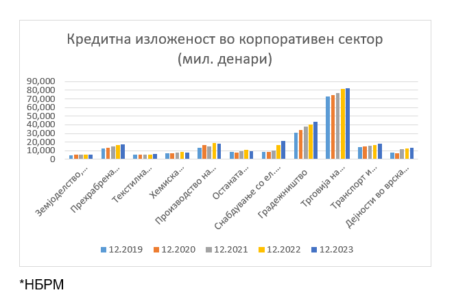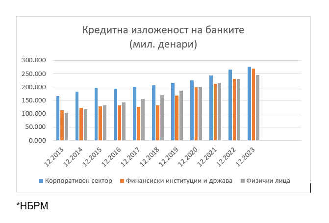 Податоците на Народната банка за кредитната активност на банките во земјава заклучно со декември 2023 година покажуваат дека банките имаат пласирано кредити во вкупен износ од 244.795 милиони денари кај домаќинствата. Кредитната изложеност кон компаниите изнесува 276.240 милиони денари, а кон финансиските институции и кон државата 268.448 милиони денари. Ова практично значи дека трите сектори се речиси изедначени.