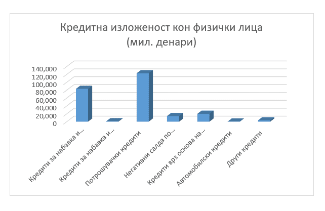Од вкупната кредитна изложеност на банките кон физичките лица во износ од 244.795 милиони денари, дури 122.702 милиони денари, односно половина се потрошувачки кредити.