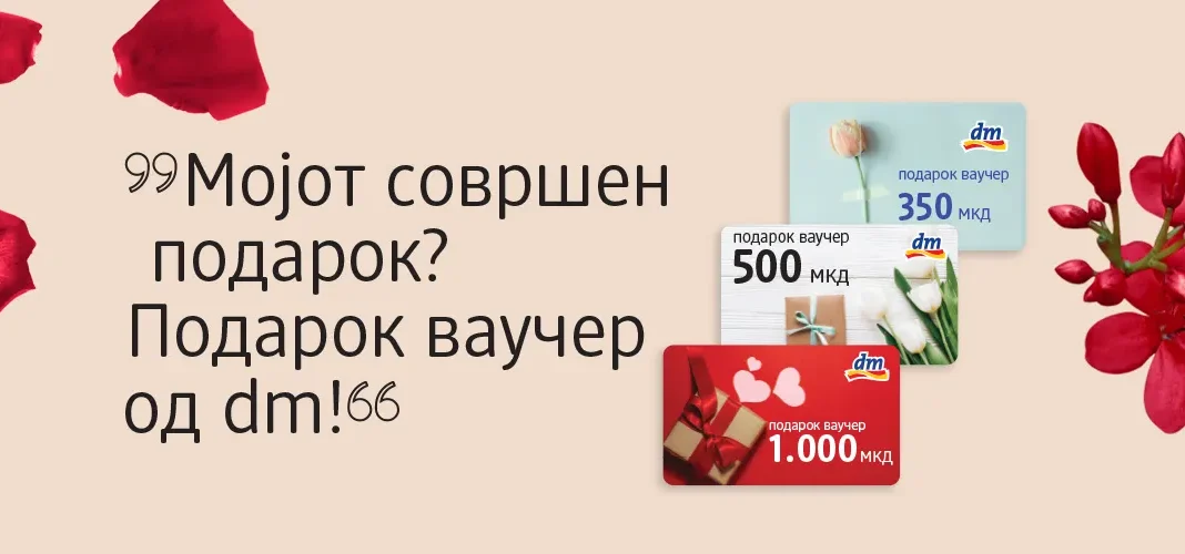 Достапни во износ од 350, 500 и 1.000 денари, dm подарок ваучерите ви овозможуваат да го изберете токму тоа што го сакаат вашите блиски. Без разлика дали станува збор за шминка, производи за нега и убавина или органска храна – секој може да најде нешто во dm што ќе му донесе насмевка на лицето. Оваа слобода на избор е она што ги прави ваучерите од dm уникатни и посебни.