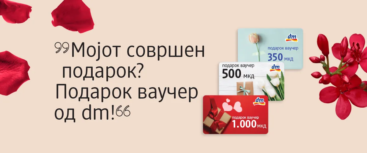 Новогодишните и божиќните празници се вистинско време, со мали гестови да им покажеме на нашите најблиски колку сме им благодарни што внесуваат радост во нашето секојдневие. А, кога станува збор за совршениот подарок, ние имаме една идеја, што сигурни сме дека ќе ви се допадне! Што велите за подарок ваучер од dm? Овие ваучери не се само обични подароци, туку и клуч за исполнување на желбите на вашите пријатели, семејството и колегите. Со овие ваучери, во дрогериите на dm можете да се купат голем број на подароци соодветни за предновогодишното дарување кои ќе донесат насмевка на лицата на Вашите најблиски.