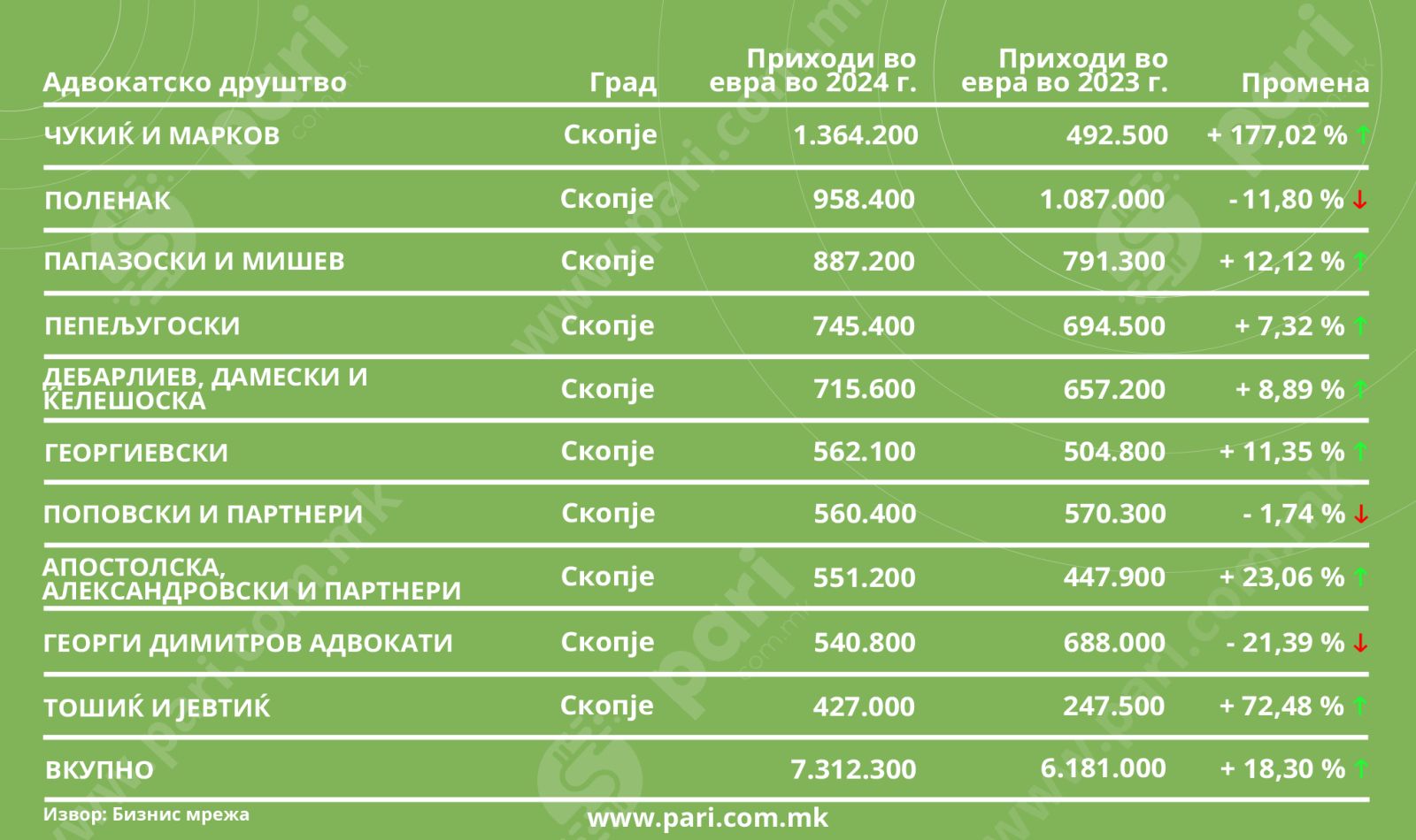 Кај 10 од сите 76 адвокатски друштва се слеале речиси половина, поконкретно, 49,88 насто од вкупно реализираните приходи. Станува збор за сума од 7,3 милиони евра. Годишниот напредок е измерен со 18,3 насто, затоа што во 2023 година заедничкиот учинок бил близу 6,2 милиони евра.