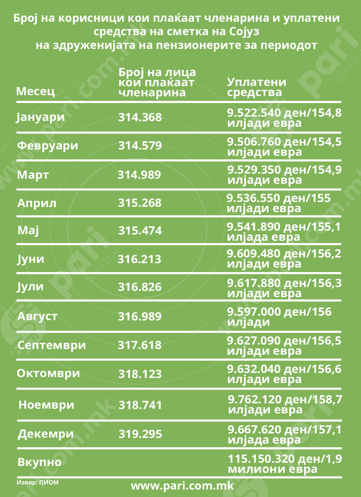 Од анализата што ја направи порталот „Пари“ врз основа на расположливите годишни податоци, се гледа дека лани на сметката од Сојуз на здруженијата на пензионерите „легнале“ близу 1,9 милиони евра (1,8 милиони евра во 2022). Тоа е вкупниот износ од уплатите вршени во текот на целата година, кои се движеле од над 154 до над 158 илјади евра. Од друга страна, семејствата на починатите пензионери добиле 7,5 милиони евра. Добро е што износот е понизок од нотираните 8,6 милиони евра на крајот од 2022 година.