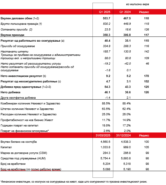 - Вкупниот деловен обем на Групацијата порасна за 18% во споредба со Q1, 2024-та година, достигнувајќи 553,7 милиони евра, првенствено поради зголемување на бруто полисираната премија.