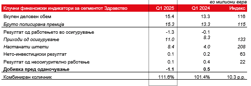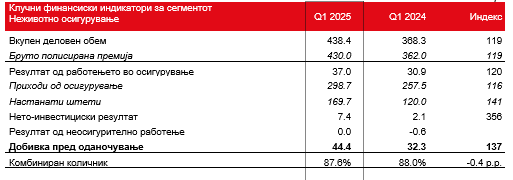 Комбинираниот количник за Неживотно осигурување и Здравство изнесуваше поволни 88,5%, задржувајќи се на исто ниво како минатата година. Количникот за штети се зголеми за 1,1 процентен поен и достигна 63,5%, како резултат на растот на портфолиото на осигурување, малку повисоко ниво на катастрофални штети во споредба со истиот период минатата година и позитивното влијание од ослободувањето на резервите за прекинати работења во споредбениот период. Расходниот количник се намали на 25,0% (Q1, 2024: 26,0%), како резултат на поголемиот раст на приходите во однос на трошоците.