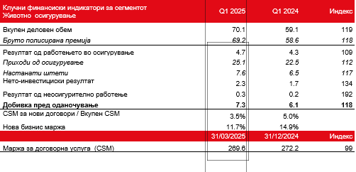 Маржата за договорна услуга (CSM) изнесуваше 269,6 милиони евра, што е за еден процентен поен пониско од крајот на 2024-та година година. Намалувањето произлегува од промена на параметрите (односно ефектот од пониска прераспределба на животното осигурување поради помала инфлација од прогнозата на Народната банка на Словенија и ефектот од надградба на моделот за ануитетно осигурување). Маржата за договорни услуги (CSM) кај новите договори изнесува 3,5% (прв квартал 2024: 5,0%), што претставува вкупно 9,5 милиони евра. Маржата за договорни услуги од 9,3 милиони евра беше ослободена во добивка или загуба.