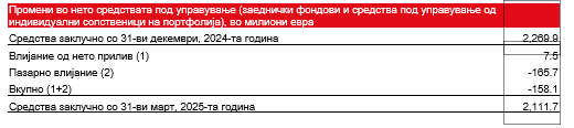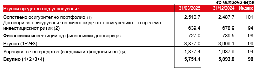 Вкупните средства под управување на Групацијата, заклучно со 31-ви март, 2025-та година, изнесуваше 5,8 милијарди евра, што претставува намалување од 2% во однос на 31-ви декември, 2024-та година.