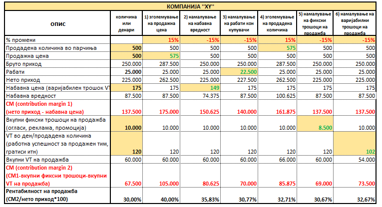 • Ако ја зголемиме продажната цена за 15% т.е од 500 на 575 ден, нето приходот ќе се зголеми за околу 16% (од 225.000 ден на 262.500 ден), додека резултатот ќе се зголеми за околку 56% (од 67.500 ден на 105.000 ден), а рентабилноста ќе порасне од 30% на 40%, што е 33% повеќе!!! Одлично под услов, да конкуренцијата нема сличен производ по пониска цена.