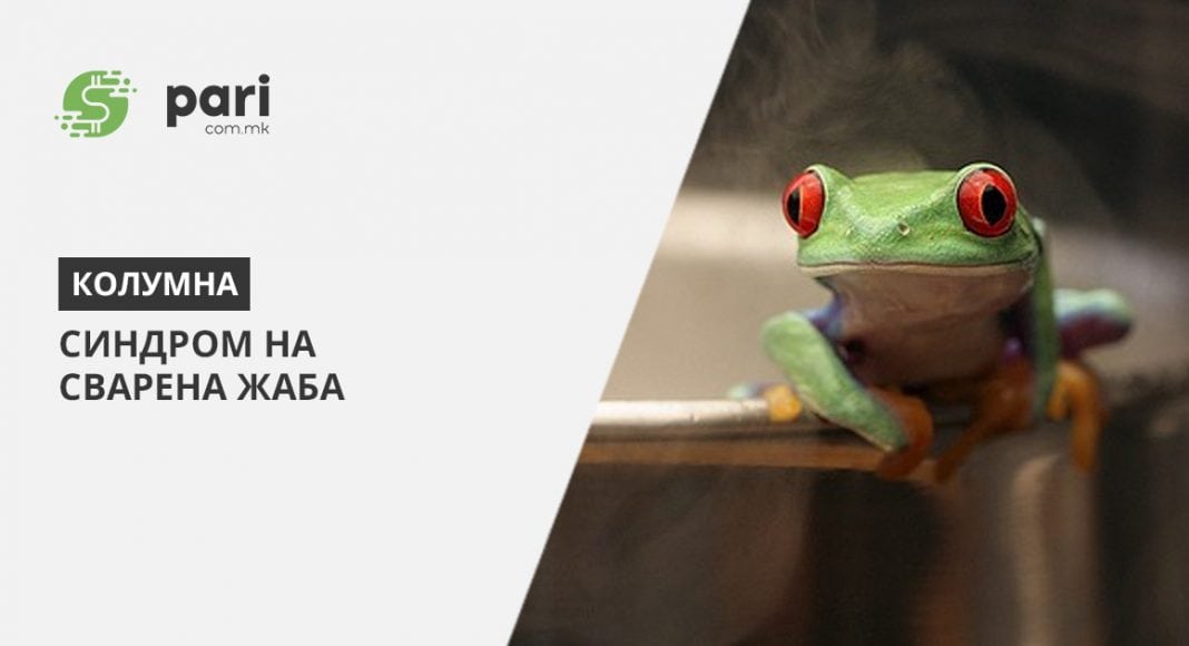 Примерот со жабата неминовно потсеќа на состојбата со македонските компании. Голем е бројот на згаснати компании кои прилагодувајќи се на новите услови, целосно го загубиле осетот дека треба да направат покрупни чекори. Зошто е тоа така? Ќе наведеме неколку причини, а сигурни има уште еден куп други. Поентата на овој текст не е да се детектираат причините туку да се подигне нивото на размислување на претприемачите и на оние кои се одговорни за обезбедување здрава бизнис клима.