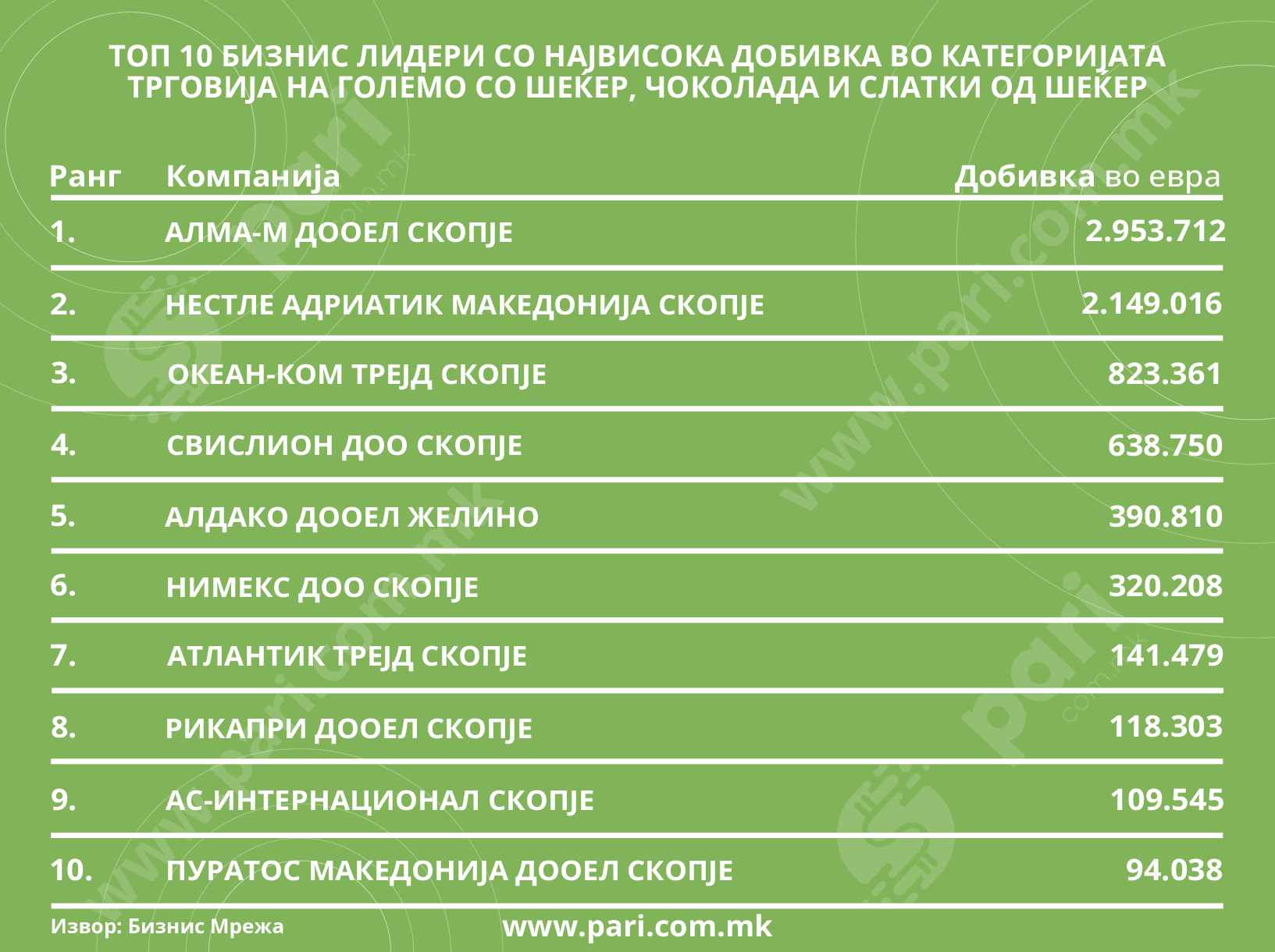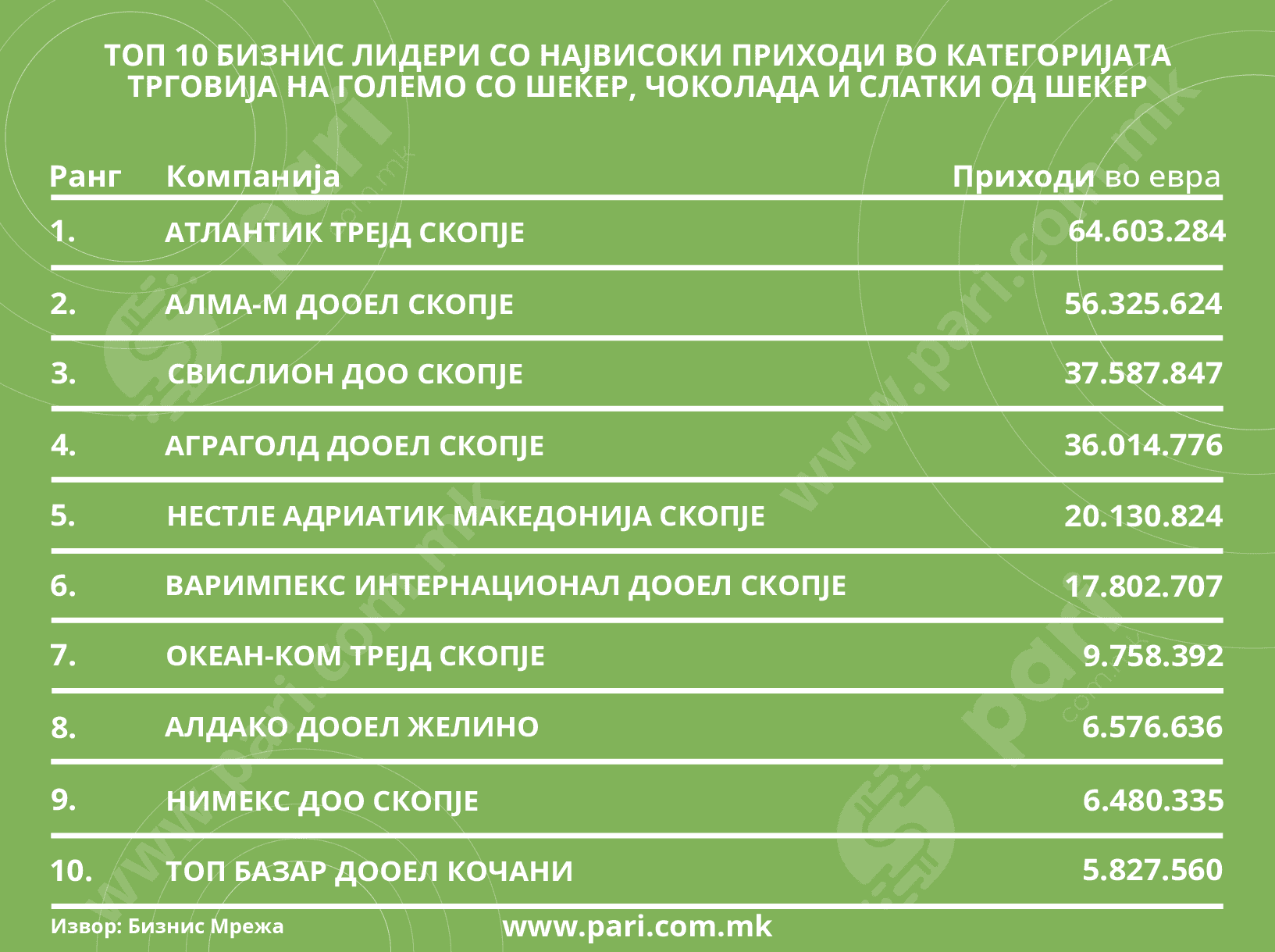 Компаниите како Атлантик, Алма-М и Свислион се меѓу водечките во оваа област, со значителни приходи и широк спектар на производи. Тие се меѓу топ три со највисоки приходи и се меѓу првите три најголеми работодавци во категоријата трговија на големо со шеќер, чоколада и слатки од шеќер. Тоа го покажа анализата што ја направи порталот Пари.