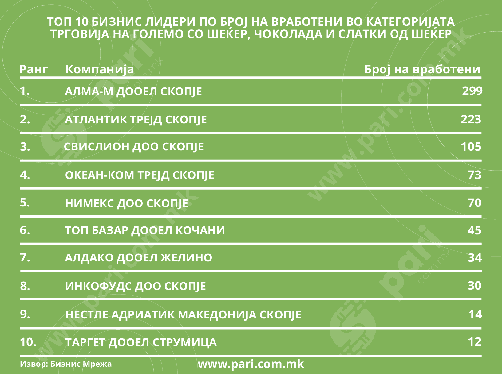 Во овие десет бизнис-лидери има вкупно 3.598 вработени луѓе коишто се грижат за слатките задоволства на рафтовите. И во овој сегмент се истакнува Алма-М, со 299 вработени. Веднаш зад неа е Атлантик Трејд со 223 лица. На третата позиција е Свислион, каде што заработуваат 105 лица. Со неа завршуваат фирмите со повеќе од сто вработени.