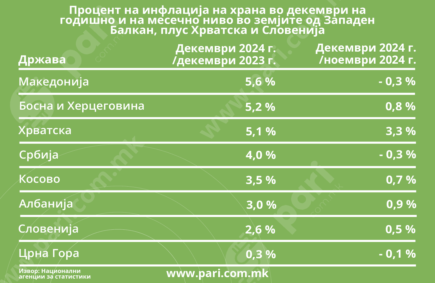 Од податоците може да се види и дека декемвриската инфлација на храна се намалува во однос на ноемвриската само во Македонија, Србија и Црна Гора.