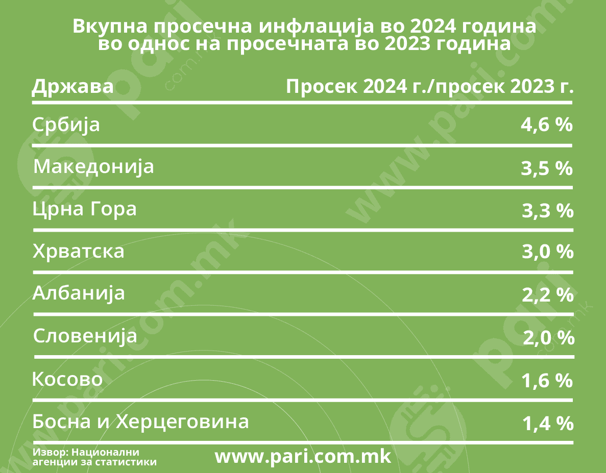 Регионалната анализа покажува дека и во однос на вкупната инфлација, Македонија лошо стои. Со просечната инфлација од 3,5 насто во 2024 година во однос на 2023 година, кај нас има пониска инфлација само во однос на Србија, каде што е 4,6 насто. Од земјите од Западен Балкан, податоците покажуваат дека најниска инфлација имала Босна и Херцеговина, 1,4 насто.