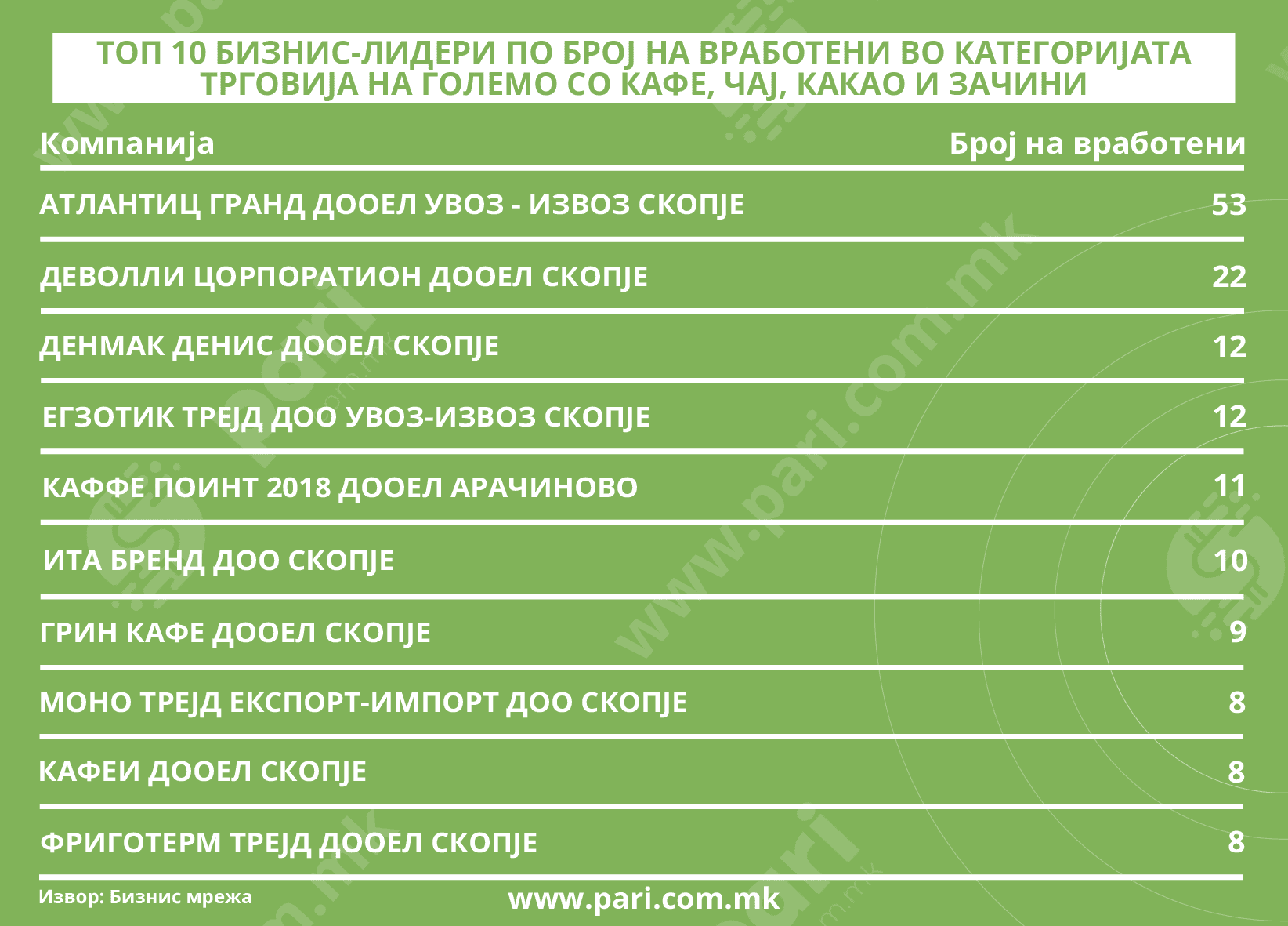 Ај, на кафе! Без тоа во Македонија не се може. Не сме Англичани, но и чајот, особено во зима, се троши. Зачините, пак, стануваат сè поприсутни на нашите трпези. Ова се одлични адути за успех во секторот трговија со кафе, какао, чај и зачини, кој лани заеднички завртил 41,3 милиони евра приход, создал 2,1 милиони евра добивка и бил дом на 153 вработени, покажува анализата на Пари во соработка со Бизнис мрежа.