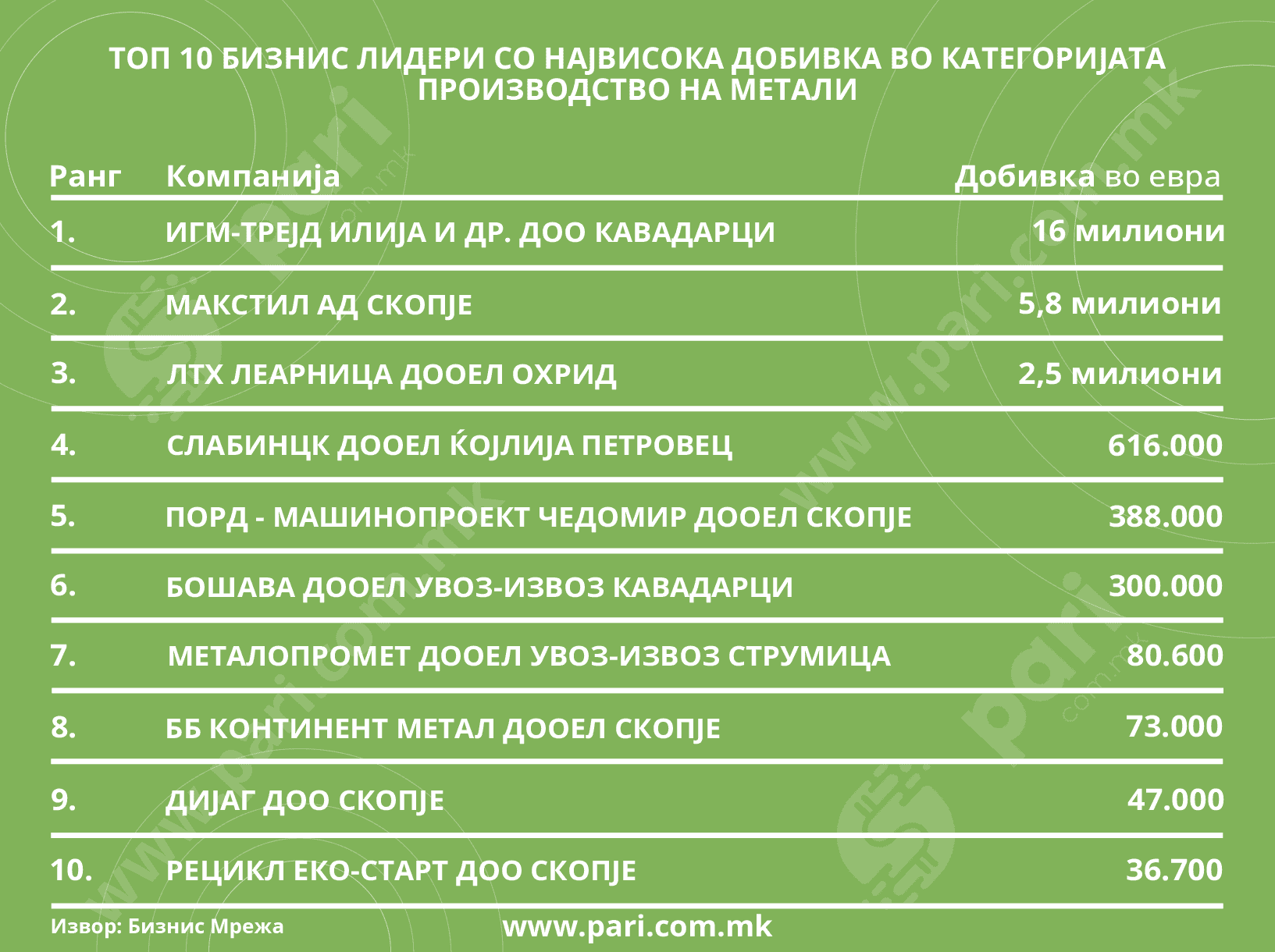 Порталот Пари во соработка со Бизнис мрежа ги анализираше компаниите коишто се носители на шифра на дејност 24. ТОП 10 компании по приход направиле заеднички промет од 543,5 милиони евра, ТОП 10 компании по добивка направиле заеднички профит од 25,7 милиони евра, а ТОП 10 најголеми работодавачи во оваа дејност имаат вкупно 3.136 вработени.