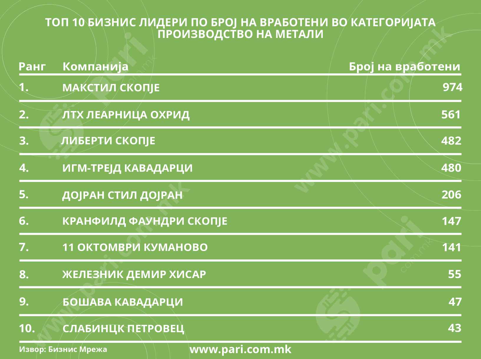 Во групата ТОП 10 работодавачи во металниот сектор се фирми со број на вработени од 43 (Слабинцк) до 974 (Макстил).