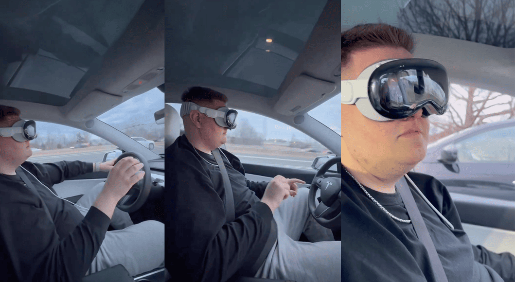 Видеото од сопственик на Tesla како ги носи новото помагало за виртуелна реалност Apple Vision Pro додека ги користи функциите за асистирано возење на автомобилот, во суштина дозволувајќи го возилото да вози и наводно е уапсен, стана вирално на социјалните мрежи и истакнува потенцијална нова опасност на патот.