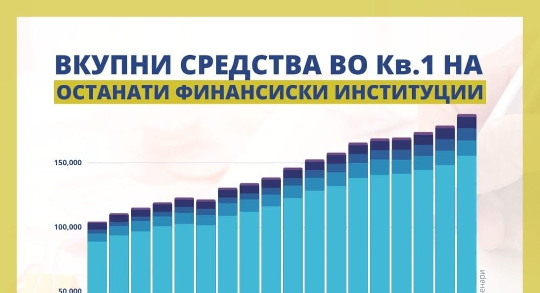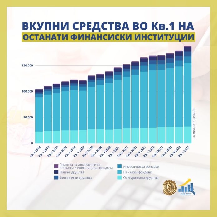Вкупните средства на останатите финансиски институции изнесуваат 187.888 милиони денари, што е раст од 9.012 милиони денари на квартална основа. Притоа, најголем е уделот на пензиските фондови – 65,4 отсто, по што следуваат осигурителните друштва со учество од 17,3 проценти, покажуваат најновите податоци на Народната банка за состојбите во овој сегмент во првото годинешно тримесечје.