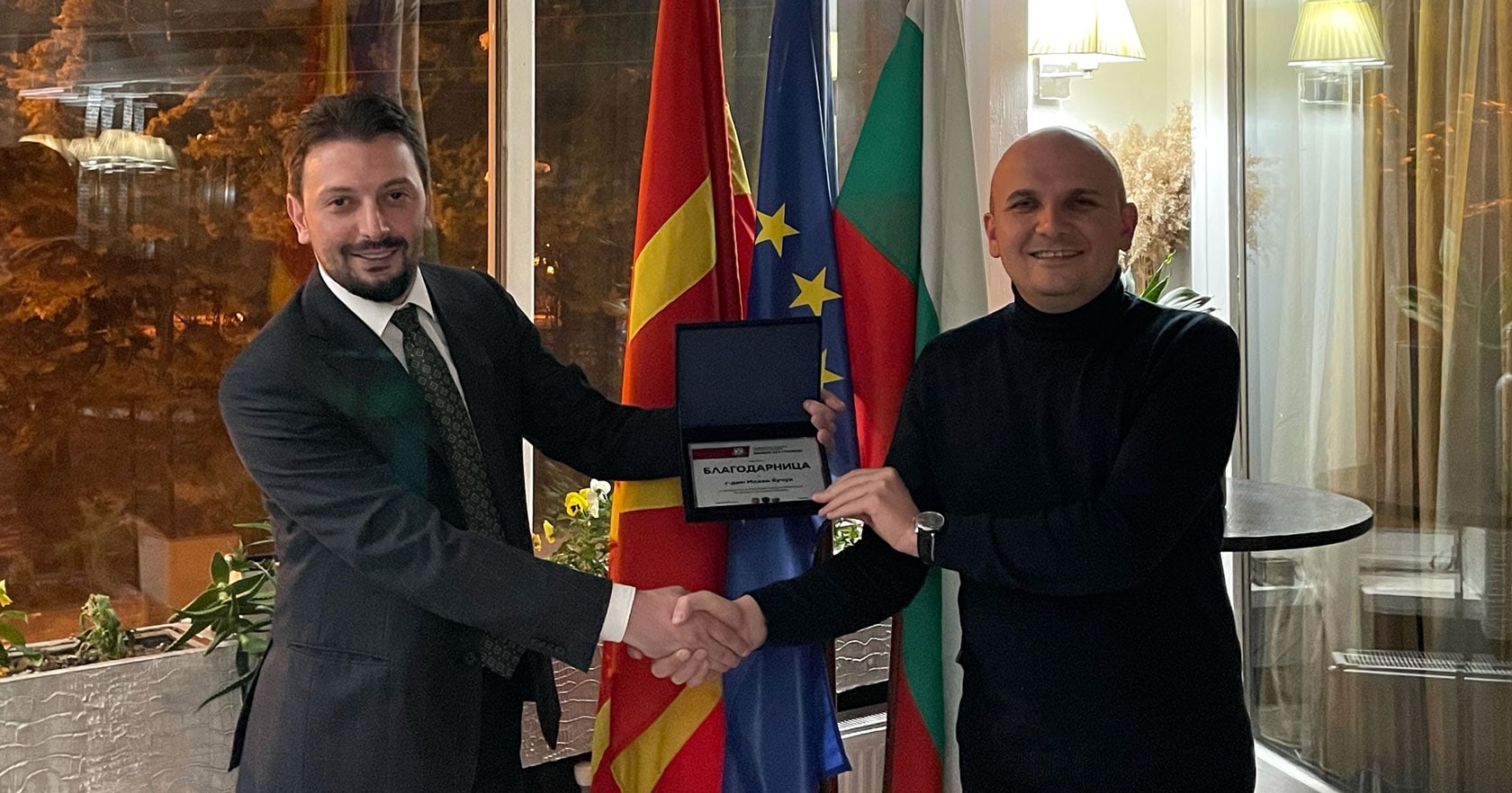 И, на крај ја искористив приликата од името на македонско-бугарската стопанска комора која во основа промовира Бизнис без граници на господинот Илхан Ќучук да му врачам Благодарница како резултат за постојаната поддршка што ја дава и ќе ја дава на Република Северна Македонија во процесот на евроинтеграција.