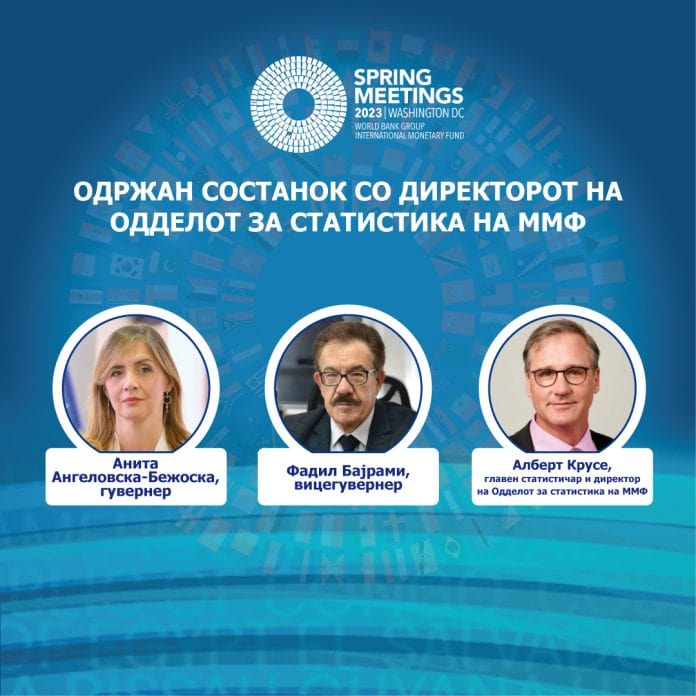 „Преку квалитетното извршување на статистичката функција, Народната банка придонесува кон јакнење на процесот на донесување одлуки на економските чинители. Во согласност со меѓународните стандарди, Народната банка ги прибира, ги изготвува и ги објавува статистичките податоци, во доменот на своите надлежности, а постојано работи и на надградба во одделни статистички домени. За ова говори и членството во највисокиот статистички стандард за дисеминација на податоци на Меѓународниот монетарен фонд – СДДС плус, којшто го исполнуваат 30 земји во светот.“ Ова беше посочено на состанокот меѓу гувернерката на Народната банка, Анита Ангеловска-Бежоска и вицегувернерот Фадил Бајрами со директорот на Одделот за статистика на ММФ, Алберт Крусе, одржан во рамките на Пролетните средби на ММФ и Светската банка во Вашингтон.